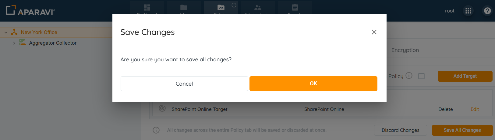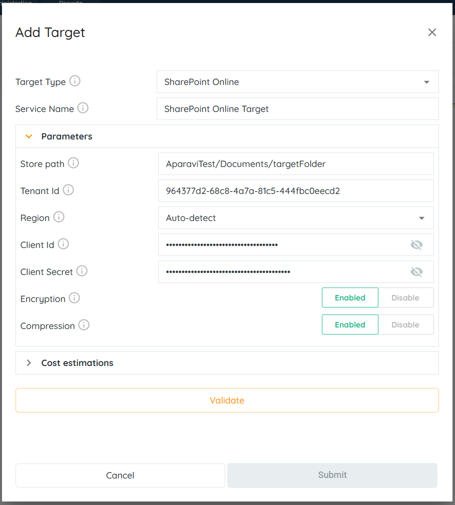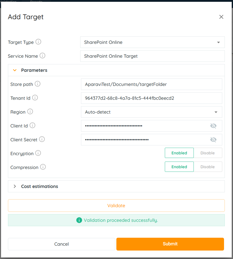 - Once the system has completed validation with the SharePoint Online target service, the Submit button will be highlighted in orange to indicate that the button is now active. Click the Submit button in the bottom right corner of the Add Target pop-up box.