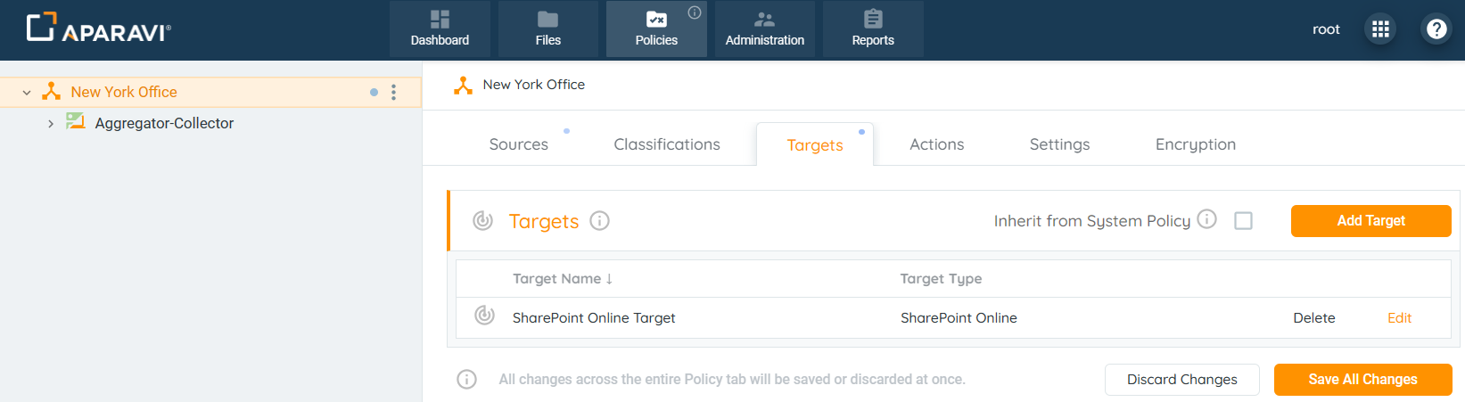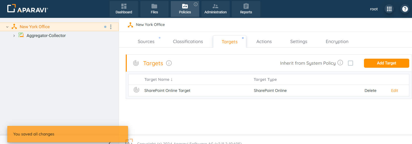 Once all changes have been successfully saved, the SharePoint target service will appear as an entry under the Targets sub-tab. Also, an alert message will display in the bottom left-hand corner to indicate that the target service has been successfully configured.