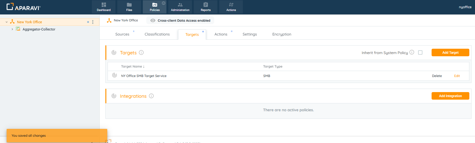 Once all changes have been successfully saved, the SMB target service will appear as an entry under the Targets sub-tab. Also, an alert message will display in the bottom left-hand corner to indicate that the target service has been successfully configured.