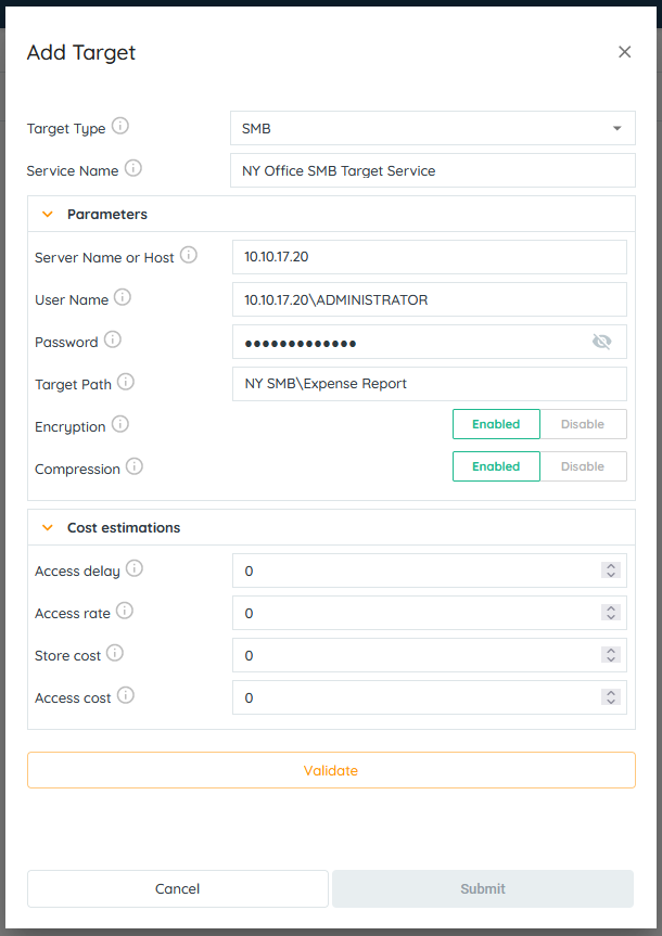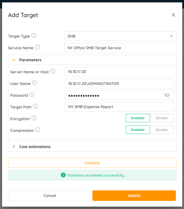 - Once the system has completed validation with the SMB target service, the Submit button will be highlighted in orange to indicate that the button is now active. Click the Submit button in the bottom right corner of the Add Target pop-up box.