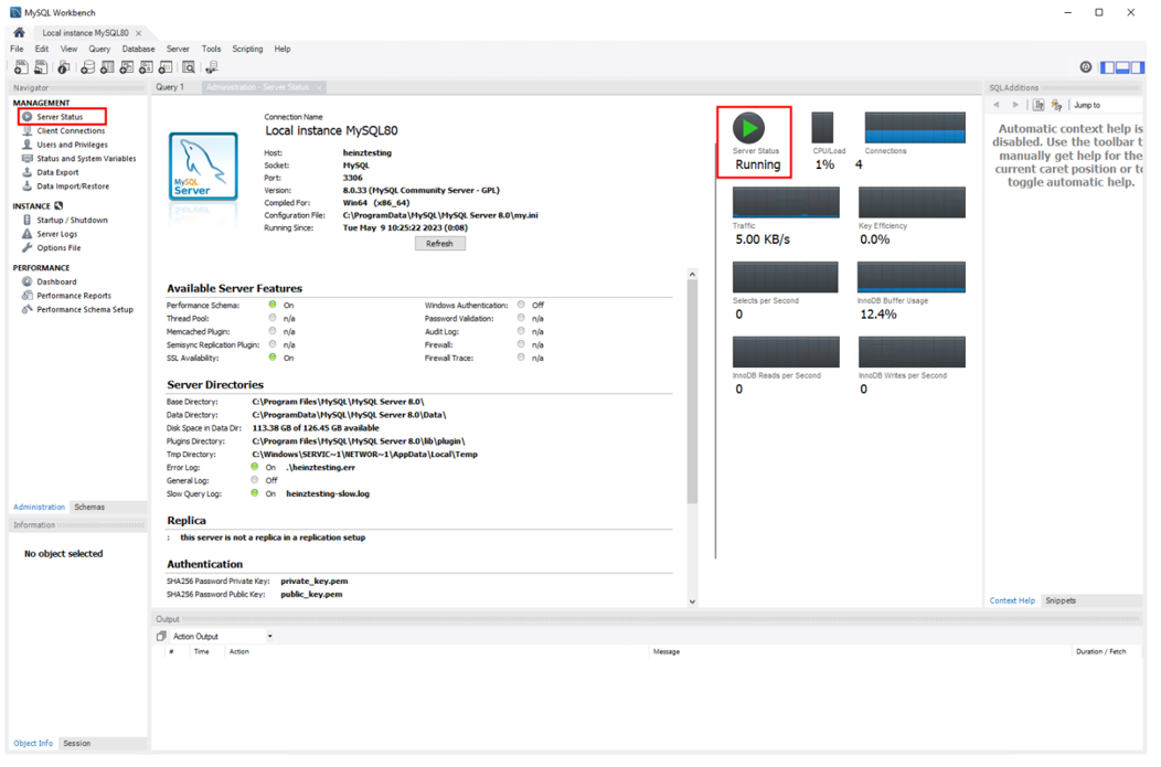 - Within this window, you will see the status of the MySQL service. From this window, you will be able to see overall health of the server.