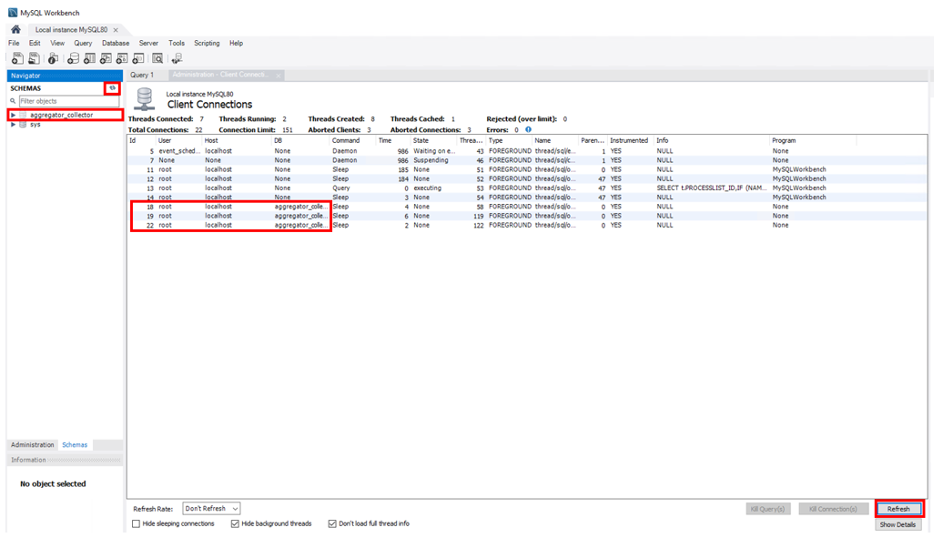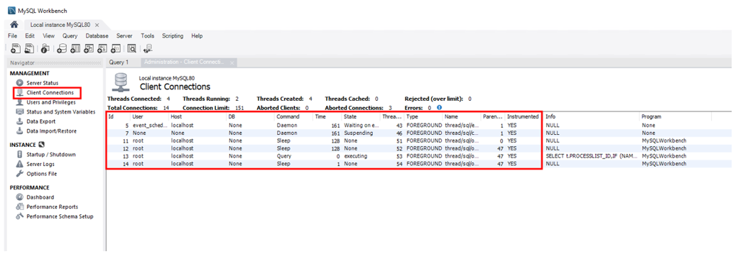 To identify the node connection to the MySQL Instance click on the Client Connections under management. From this window, you will be able to see all connections to the MySQL instance. By clicking on the Refresh button you will be able to refresh all links to confirm.