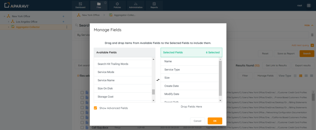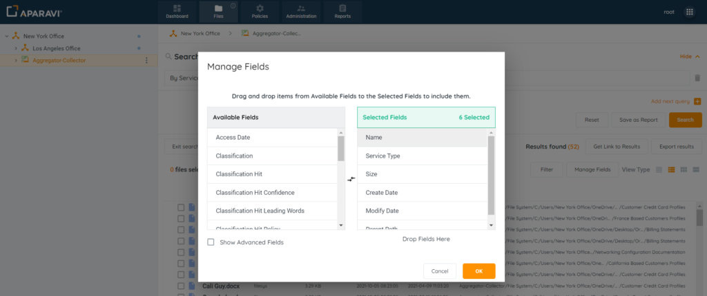 In addition to the fields that appear within the two sections, there is a checkbox located in the bottom left-hand side of the pop-up box, beside the label “Show Advanced Fields,” that when clicked on, will offer many more field options to be added. To add or remove these fields, follow the same steps as above.