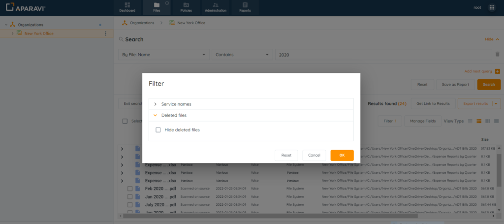 6. By default, all searches will omit deleted files unless the option has been deselected. If deleted files should appear in the audit log, click on the Filter button located above the file results. Expand the Deleted files section and click on the checkbox next to “Hide Deleted Files” to deselect it. Once completed, click the Ok button to save the changes.