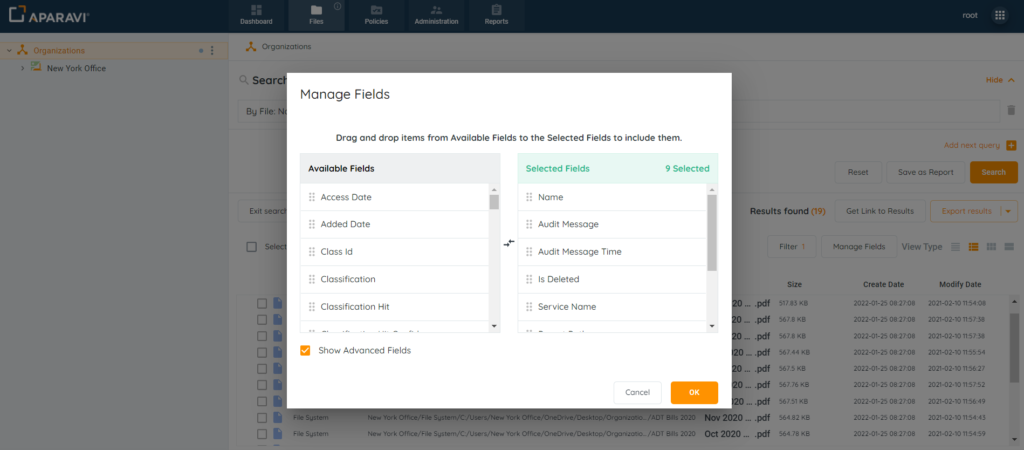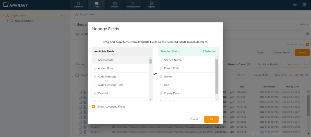 To add a field, drag it from the Available Fields section into the Selected Fields section. Once completed, click the Ok button to save the changes.