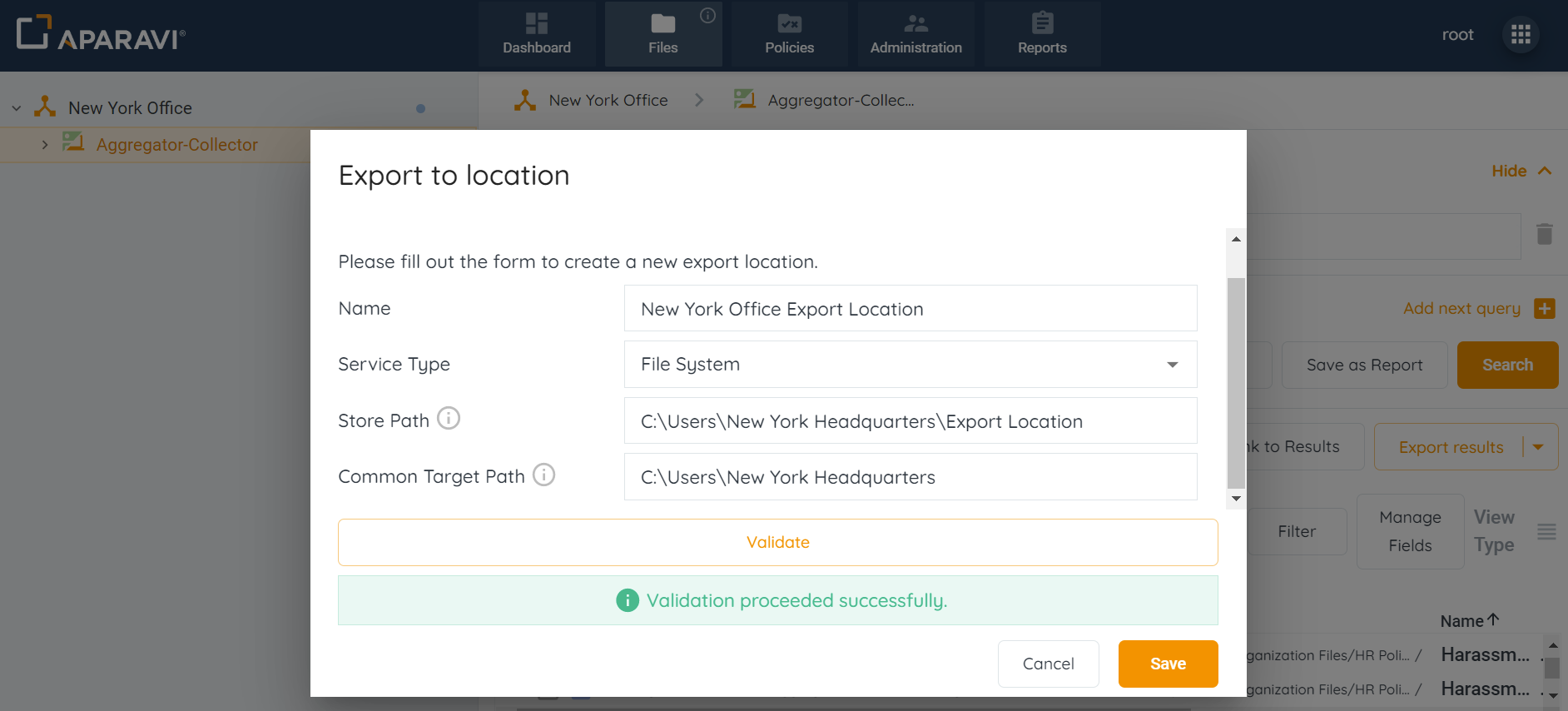 - Once all information has been entered into the Export to Location pop-up box, click on the Validate button.