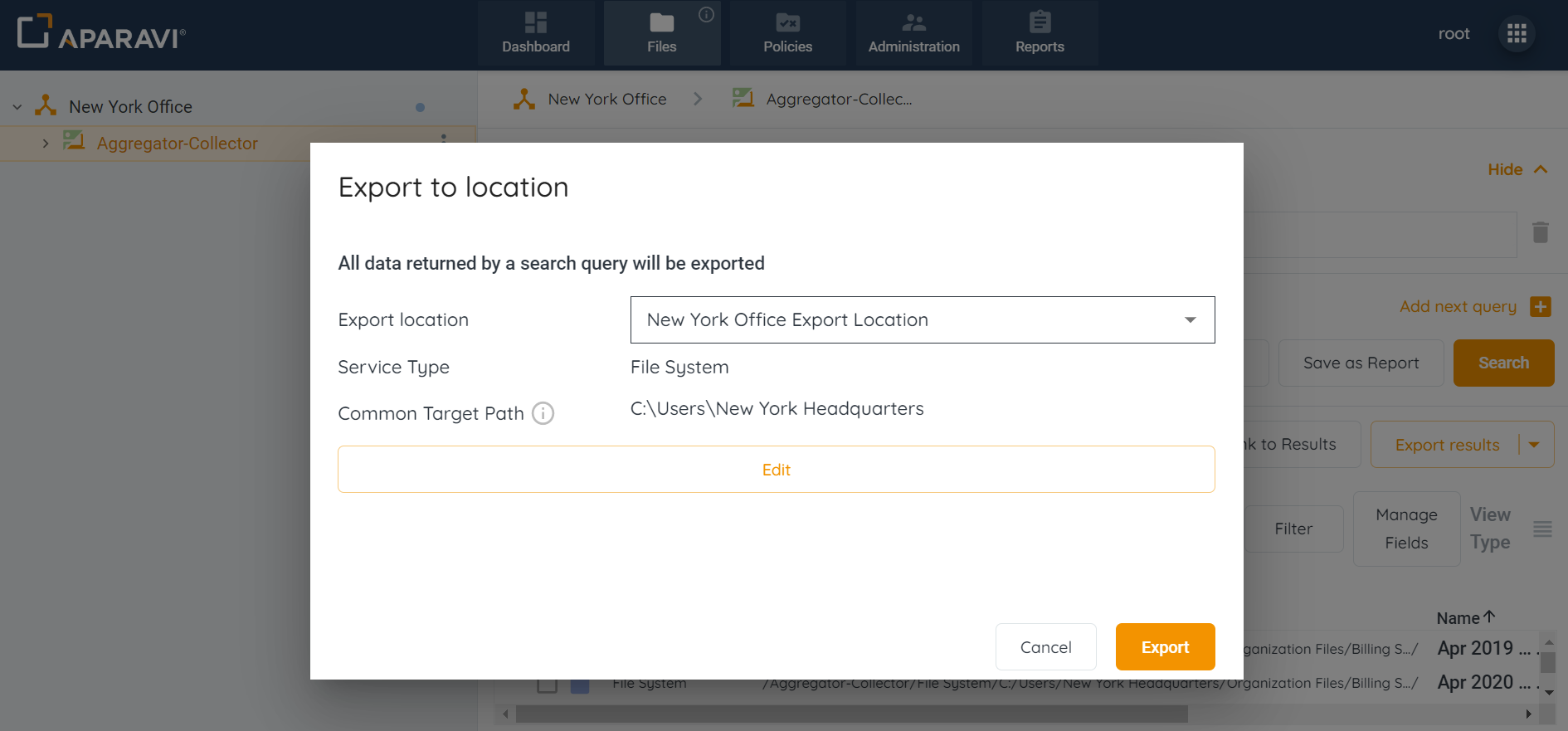 - Select where the files should be exported to by creating a new location or selecting a previously configured location.